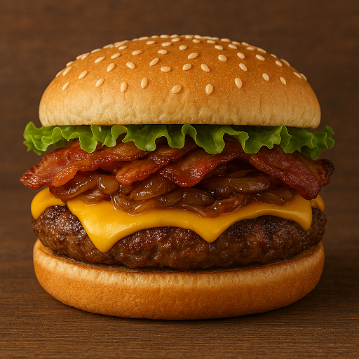 برگر گوشت گوساله 150 گرمی، ژامبون گوشت تنوری، قارچ، گوجه، کاهو، خیارشور، پنیر گودا، پیاز کاراملی، نان مک، سس تک نفره